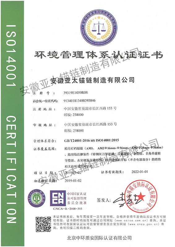 安徽亞太錨鏈制造有限公司是國家高新技術企業,也是國家GB/T 549-2017《電焊錨鏈》標準的起草和制定單位之一。公司旗下設有錨鏈分廠、浮標分廠、舾裝件分廠等多個分廠。公司專業從事φ12.5mm-φ107mm二、三級船用錨鏈、浮標錨鏈、錨鏈附件,錨、船舶曬裝產品、航標、系船浮、船型標、多種規格海洋監測浮標及航標燈等產品的生產、安裝和服務。目前公司的產品銷往全國各地船廠、碼頭、航標處、航道局、海洋局,并已走上國際市場,如東南亞、中東、歐美等國家。